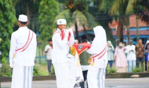 NARASI JURNAL.COM, DHARMASRAYA – Bupati Dharmasraya, Sutan Riska Tuanku Kerajaan bertindak sebagai Pembina Upacara Bendera pada Hari Santri tahun 2022. Acara ini dilaksanakan di Halaman Kantor Bupati Dharmasraya, pada hari Sabtu, (22/10/22), yang dihadiri oleh Kakanwil Kementerian Agama Provinsi Suamatera Barat, Helmi, Ketua DPRD Dharmasraya, Pariyanto, Kapolres, Forkopimda, Ketua Pengadilan Agama, Kepala Kantor Kementerian Agama, dan undangan lainnya.