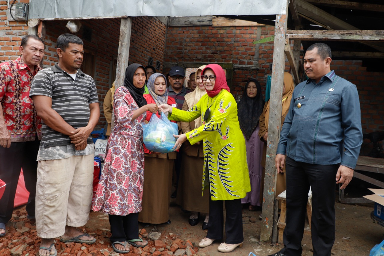 Bupati Bungo H.Mashuri bersama ketua TP PKK Bungo Hj Verawati Mashuri beserta rombongan menyerahkan bantuan kepada warga yang rumahnya roboh di terjang hujan deras pada hari Jum’at lalu.