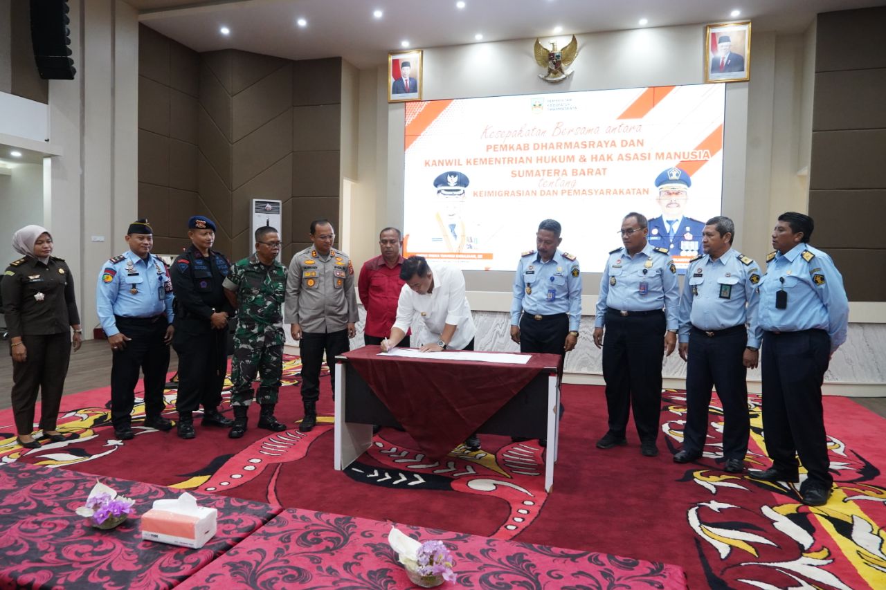 Penandatanganan kesepakatan bersama antara Pemkab Dharmasraya dengan kantor wilayah Kementerian Hukum dan HAM Sumatera Barat. Dan akan ditindaklanjuti dengan perjanjian kerja sama salah satunya yaitu antara Dinas Kependudukan dan Pencatatan Sipil dengan Lembaga Pemasyarakatan Kelas III Dharmasraya.