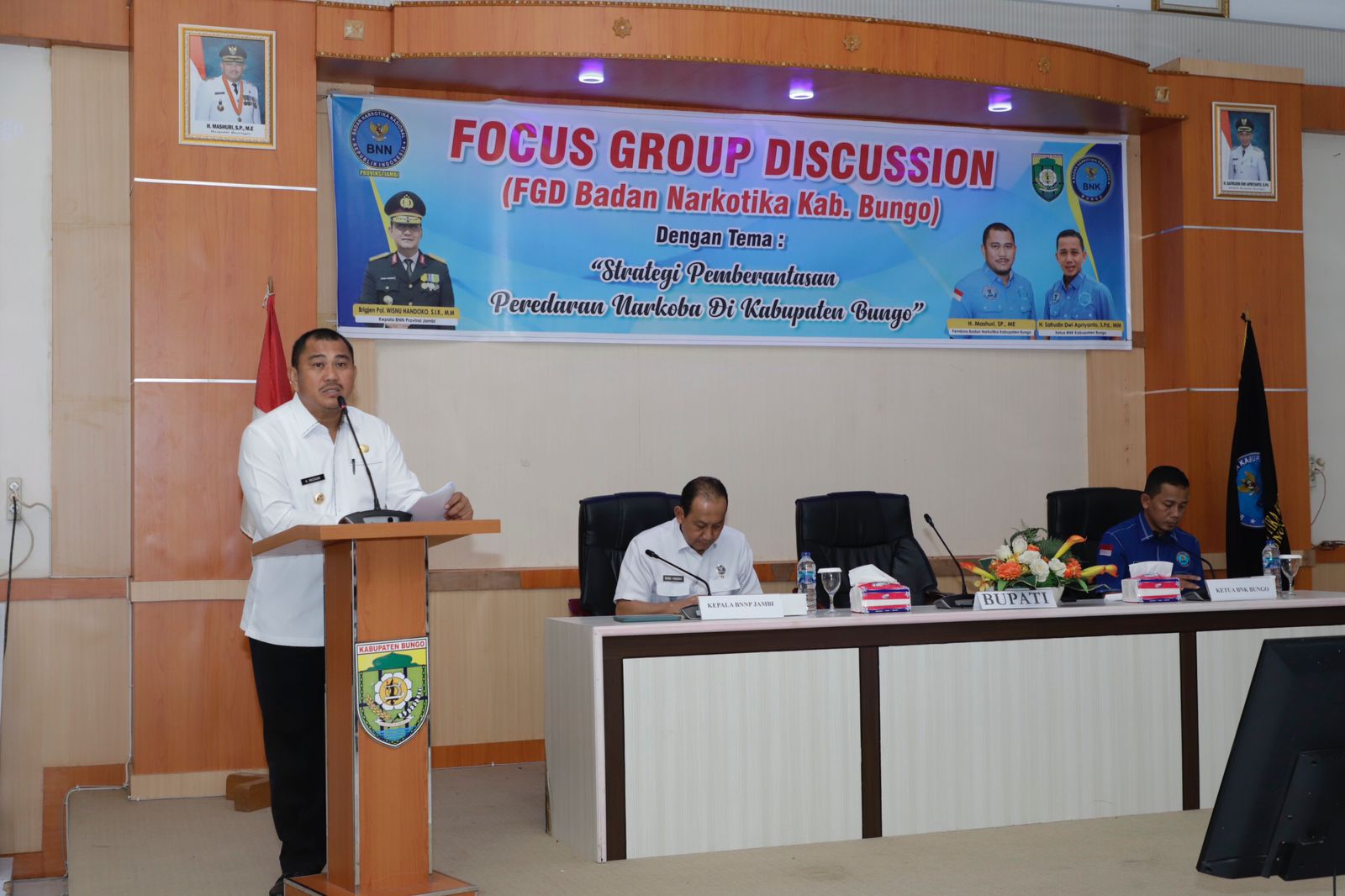 FGD Badan Narkotika Kabupaten Bungo tersebut di buka oleh kepala BNNP ( Badan Nasional Narkotika Provinsi) Jambi Brigjen Pol. Wisnu Handoko,S.I.K,M.M yang dihadiri oleh Bupati Bungo H.Mashuri.S.P.M.E Wakil Bupati Bungo sekaligus Ketua BNK H.Safrudin Dwi Aprianto,S.Pd.,M.M, Unsur Forkopimda, Kapolres Bungo, Kepala pengadilan negeri Bungo, Kalapas kelas IIB Bungo, Tokoh Masyarakat Kabupaten Bungo, Asisten, Staf Ahli Bupati,Kepala OPD, Kabag, Camat, Ketua MUI,Ketua LAM, Perwakilan Organisasi Masyarakat (Ormas) serta tamu undangan yang lainnya.